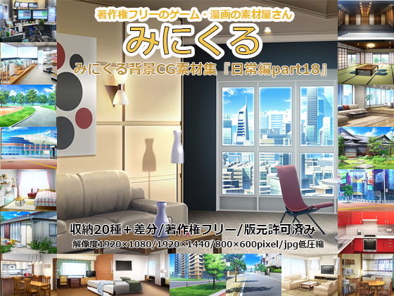 このページでは、同人作品「みにくる背景CG素材集『日常編part18』(背景専門店みにくる)」を紹介します。